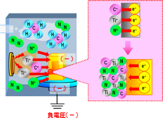 - 装置内の金属ターゲット( Ti )をアーク放電によって蒸発させることで金属イオンが発生する。